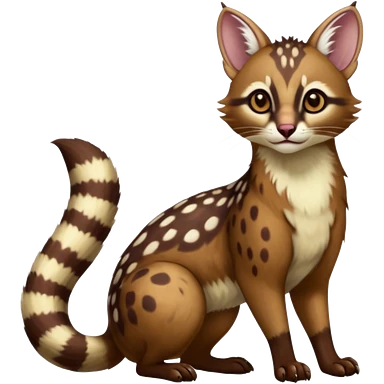 Colorful dark realistic chocolate-brown tropical beige fur glorious divine exotic cute cool beautiful shiny beautiful fantasy-Furret-Eevee-caracal-civet-genet-sergal-vernid-Cacomistle-oncilla-animal-hybrid-fursona with white deer-spots pattern markings (full body)emoji