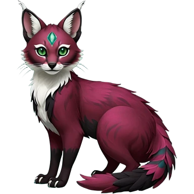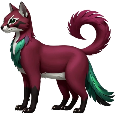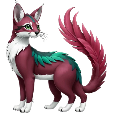 Colorful dark tropical feathery tribal dark burgundy wine-red obsidian-black jade-green white glorious iridescent divine exotic cute cool beautiful beautiful fantasy-caracal-civet-genet-sergal-vernid-Gryphon-Cacomistle-Trico-oncilla-animal-Fakémon-hybrid-fursona (full body)emoji