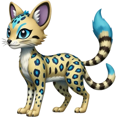 Colorful Meloetta-Sergal-Vernid-Serval-Civet-Genet-Pokémon-Digimon-Fakémon-fusion-hybrid-creature with Cyan stripes and blue leopard-spot-markings emoji