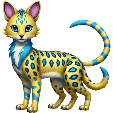 Colorful Golden Gold Shiny Lombax-Sergal-Vernid-Trico-Serval-Civet-Genet-Pokémon-Digimon-Fakémon-fusion-hybrid-creature with Cyan stripes and blue leopard-spot-markings emoji