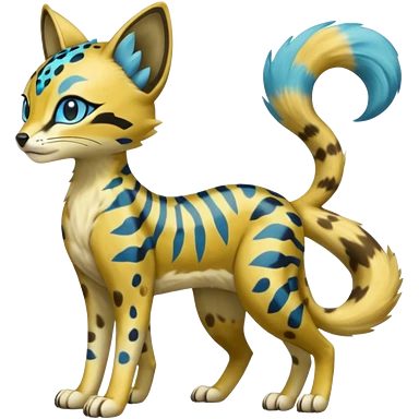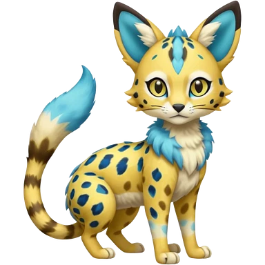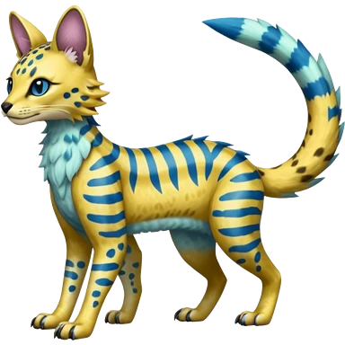 Colorful Golden Gold Shiny Lombax-Sergal-Vernid-Serval-Civet-Genet-Pokémon-Digimon-Fakémon-fusion-hybrid-creature with Cyan stripes and blue leopard-spot-markings emoji