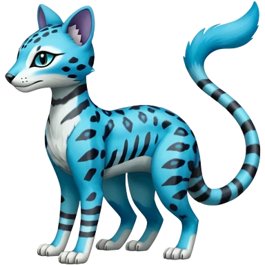 Colorful Meloetta-Sergal-Serval-Civet-Genet-Pokémon-Digimon-Fakémon-fusion-hybrid-creature with Cyan stripes and blue leopard-spot-markings emoji | AI Emoji Generator