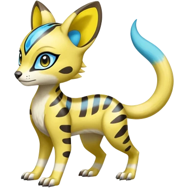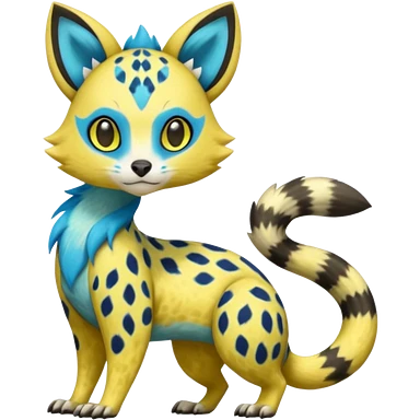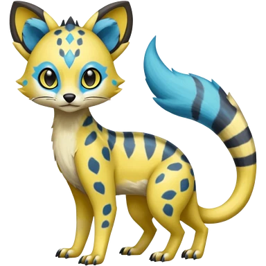 Colorful Yellow Meloetta-Civet-Sergal-Genet-Pokémon-Digimon-Fakémon-fusion-hybrid-creature with Cyan stripes and blue leopard-spot-markings emoji