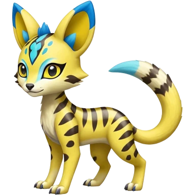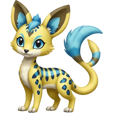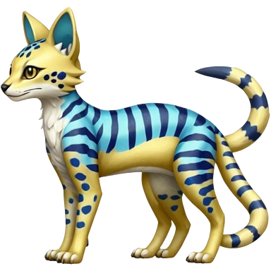 Colorful Yellow Meloetta-Sergal-Serval-Genet-Pokémon-Digimon-Fakémon-fusion-hybrid-creature with Cyan stripes and blue leopard-spot-markings emoji