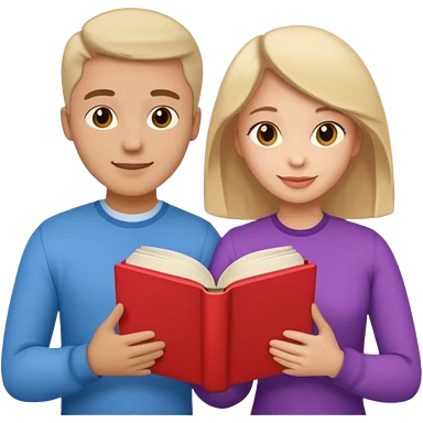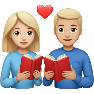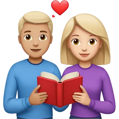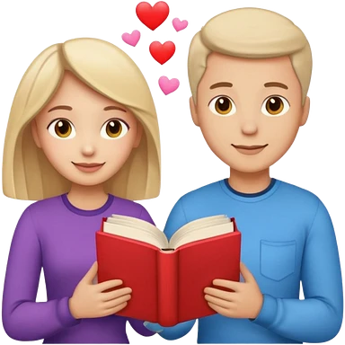 A man and a woman facing each other, both holding a single book together. From the book, colorful heart emojis are popping out playfully, creating a cheerful and romantic atmosphere emoji