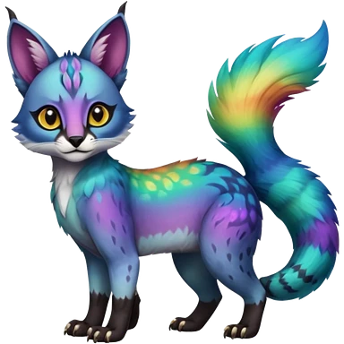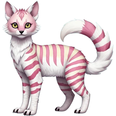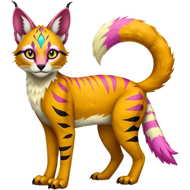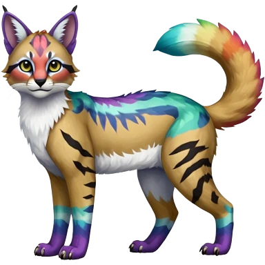 Colorful tropical tribal pale light fruity pastel white glorious iridescent divine exotic cute albino neon vibrant zigzagged cool beautiful fantasy-caracal-civet-genet-sergal-vernid-Gryphon-Cacomistle-Trico-oncilla-animal-Fakémon-hybrid-fursona (full body), facial markings, emoji