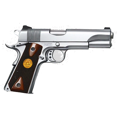 Bear jumping through the air with a 1911 pistol in his teeth and wearing a monocle on its right eye emoji