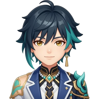 Tighnari from Genshin Impact; anime man with long-straight-dark-black hair, long black fox ears with pink Scapha, colorful-gradient-turquoise-brownish eyes, gold earring, dark-blue-sweater, green cape, white pupils emoji