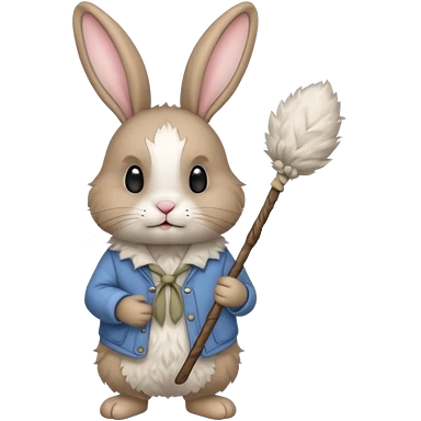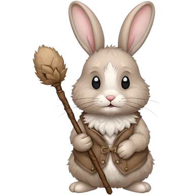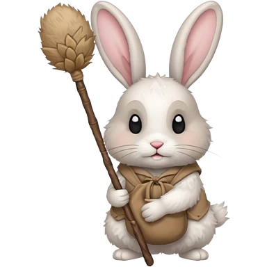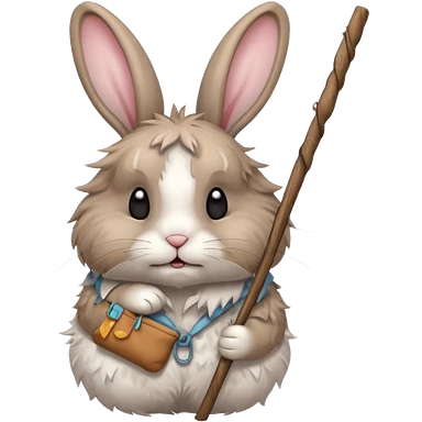 A fluffy rabbit with messy fur, carrying a patched little pouch tied to a stick, ears drooping but expression soft. emoji