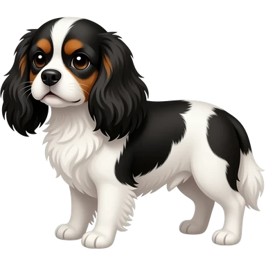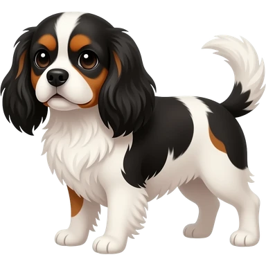 A small Cavalier King Charles Spaniel mix with black, wavy fur, white markings on the chest and muzzle, expressive eyes, and a fluffy tail. emoji