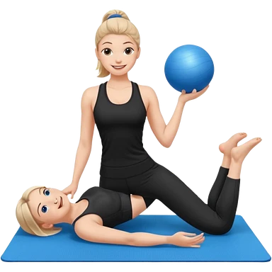 generate a pretty woman in black gym clothes doing pilates on a blue mat with a small blue ball emoji