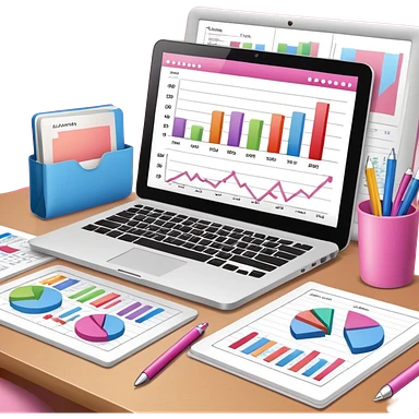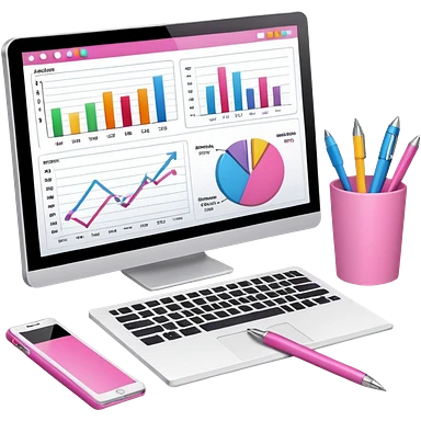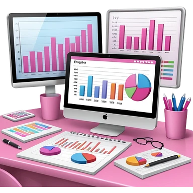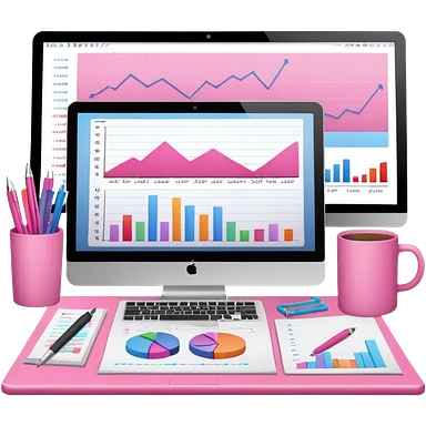 computer on a desk with papers, notes, notebook and pens showing data analysis stuff on it pink emoji
