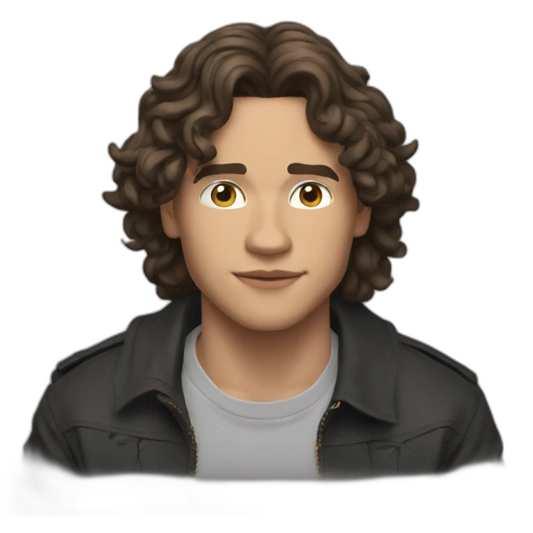 Conan Gray with long dark curly hair, a white shirt, a leather jacket with yellow stars, sunglasses, and black jeans emoji