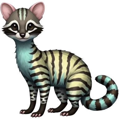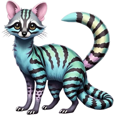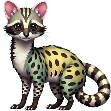Feral Rare Fantasy iridescent scaly shaded detailed colorful Genet-Trico-Civet-Cacomistle-Margay-species by LiLaiRa,, with white stripes with dark-blackish points, white belly, random markings, tufted tail, tufted ears, full body emoji