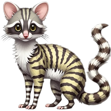 Feral Rare Fantasy shaded detailed colorful Genet-Possum-Trico-Civet-Cacomistle-Margay-species by LiLaiRa,, with white stripes with dark-blackish points, white belly, random markings, tufted tail, tufted ears, full body emoji
