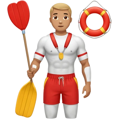 Male lifeguard – red shorts, whistle around neck, holding rescue float, full body emoji