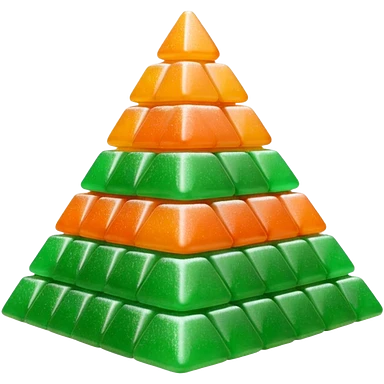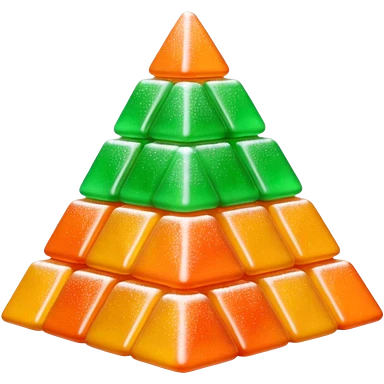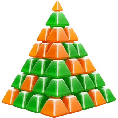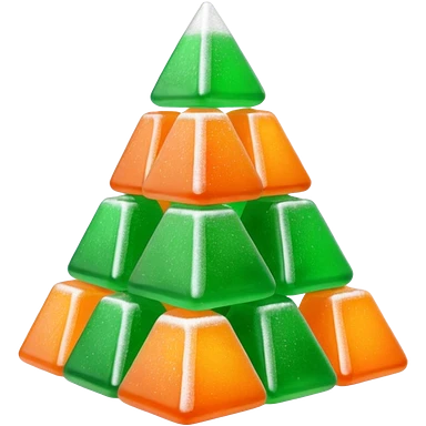 3D render of Gumdrop Pyramid, made entirely of dessert materials, glistening sugar crystal texture, stacked green and orange sugar-coated jelly candies, delicious confectionery aesthetic, Apple emoji style, isolated on white background --v 6.0. emoji