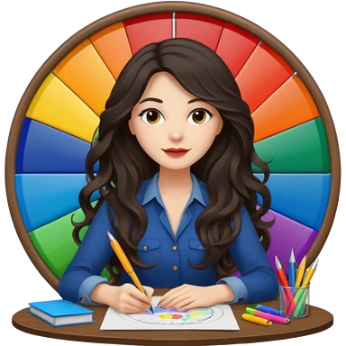 female dark wavy long hair graphic designer , big color wheel behind , pens, papers, desktop emoji