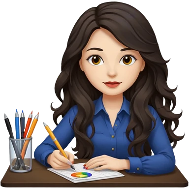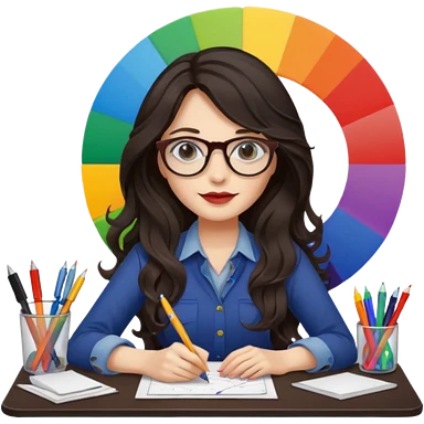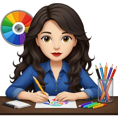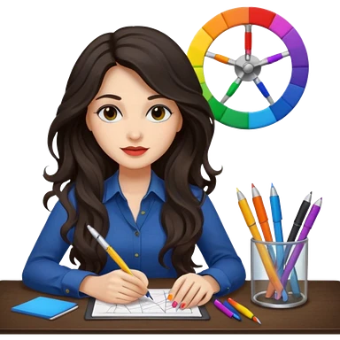 female dark wavy long hair graphic designer , color wheel, pens, papers , desktop emoji