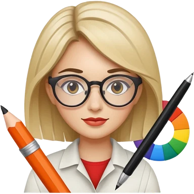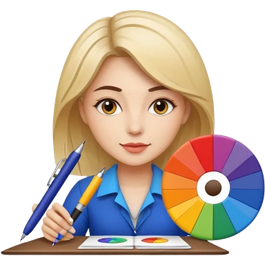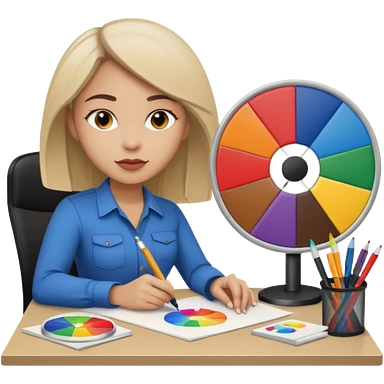 female graphic designer , color wheel, pens, papers emoji