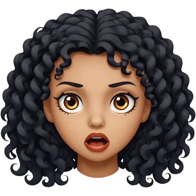 girl with long black curls and brown eyes, brown skin, eyelashes, siren eyes, make her mouth open and mad expression emoji