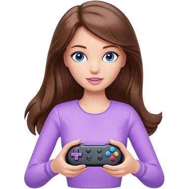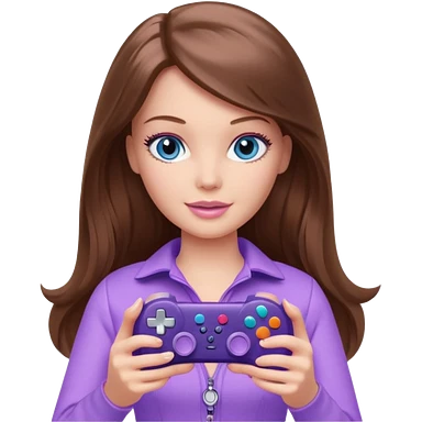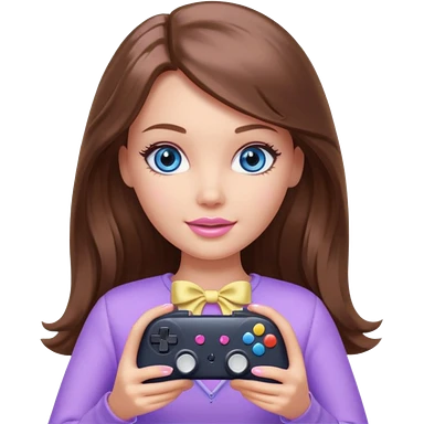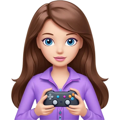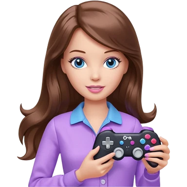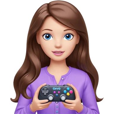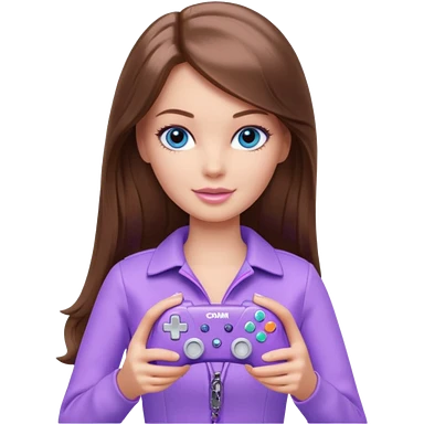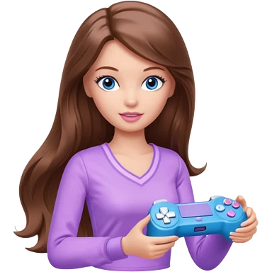 beautiful barbie girl with long brown hair, blue eyes and wearing light purple clothes playing console games with controller emoji