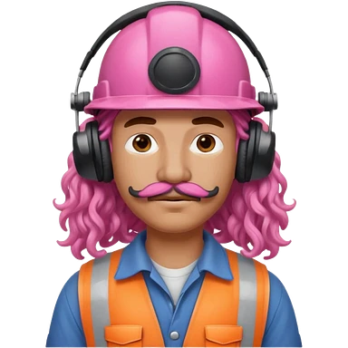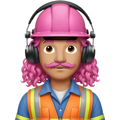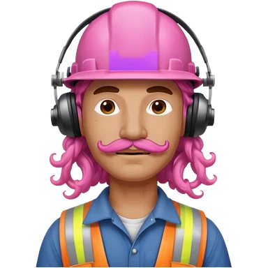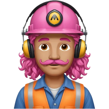 construction worker with pink curly hair and protective headphones and mustache emoji | AI Emoji Generator