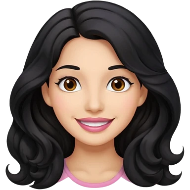 a woman is smile, her hair is long wavy and the color is black, her eyes color are brown and the color of her lip is soft pink emoji