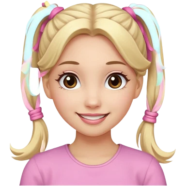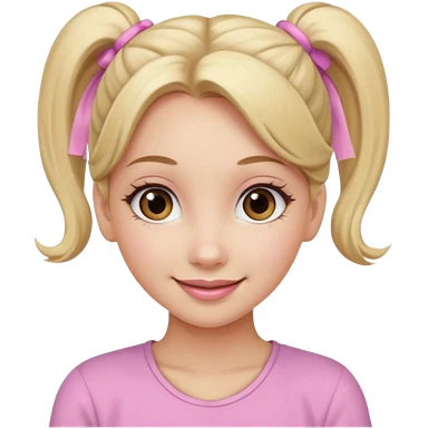 a cute woman is smiling, her hair is long, blonde and two ponytails, her eyes color are brown and the color of her lip is soft pink emoji