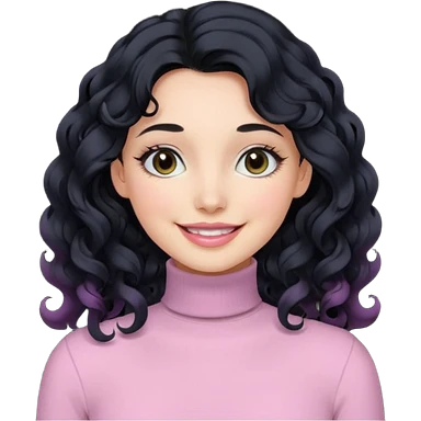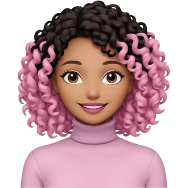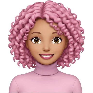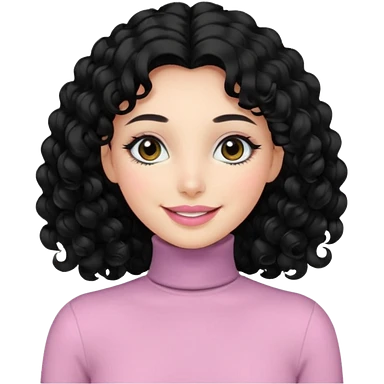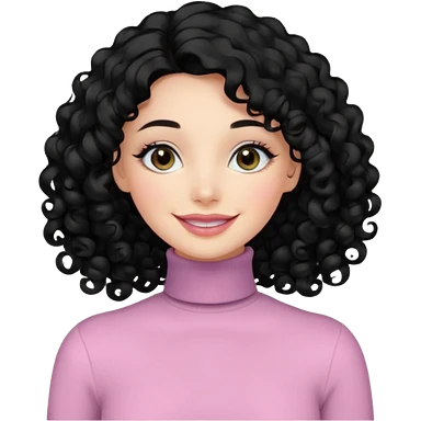 a woman with long sleeve turtle neck top and smile, her hair is long curly and the color is black, her eyes color are black and the color of her lip is soft pink emoji