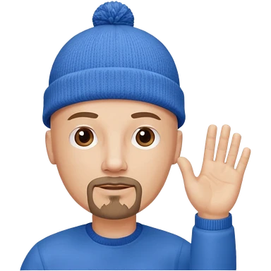 White bald with regular goatee hand raised blue knit cap emoji