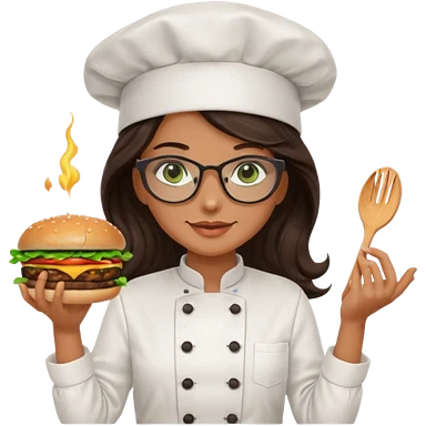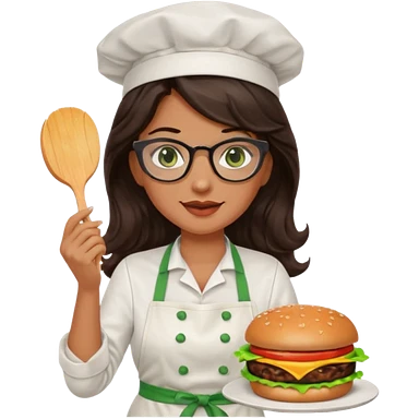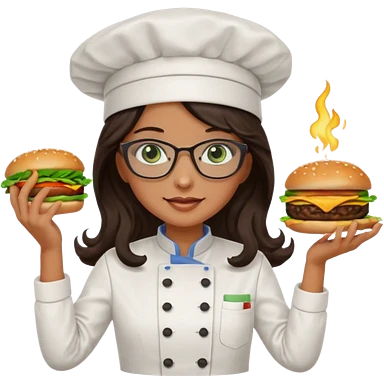 A female chef with glasses, dark brown long wavy hair, Green eyes and cooking a burger emoji