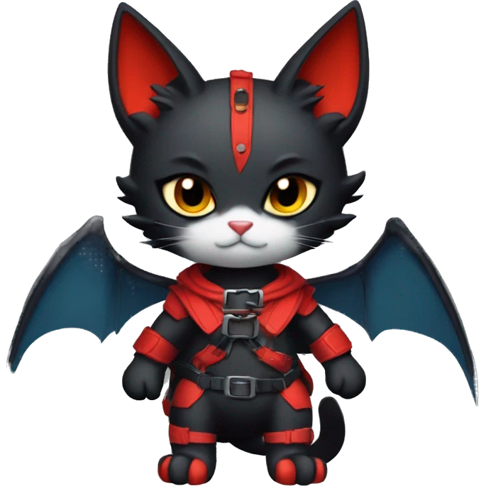 Cool Edgy Ethereal Fantasy Litten-Nargacuga-Cat with black bat-wing-ears with a red harness full body emoji | AI Emoji Generator