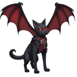 Cool Edgy Ethereal Fantasy Litten-Nargacuga-Cat with black bat-wing-ears with a red harness full body emoji