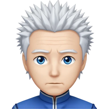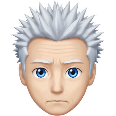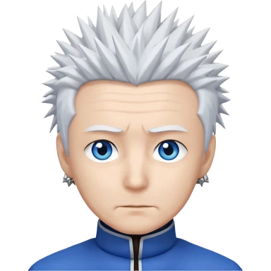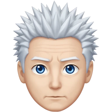 Satoru Gojo has spiky white hair with a slight blue tint and wears a black blindfold over his vivid blue eyes. He has a tall, lean build and typically wears a high-collared dark outfit, giving him a sharp and cool appearance. emoji