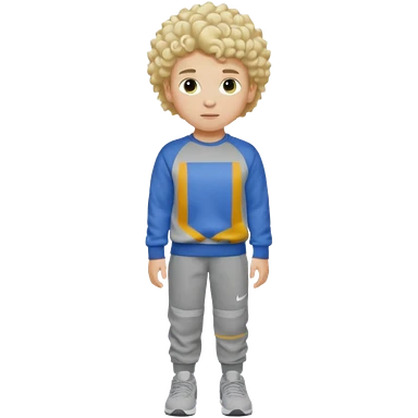 A kid with blonde hair and a perm, Grey ESSENTIALS sweater, gray Nike shoes, Grey pants and he is white. emoji