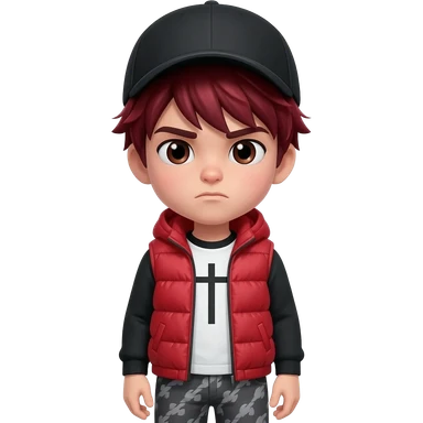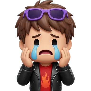 Cool Roblox boy avatar emoji, brown hair, purple sunglasses, smiling face, black leather jacket, red shirt with flame design, gray jeans, confident pose with one hand raised, playful and stylish vibe, 3D cartoon style, bright lighting, cute gaming emoji style emoji | AI Emoji Generator