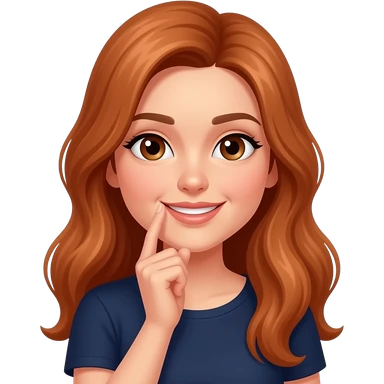 copper longer hair, sexy navy top, brown eyed female “sushh”ing and smirking a little bit. emoji