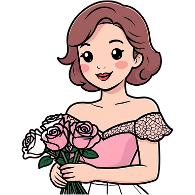 pale skin coquette girl with brown hair, pink bows, lace, pearls, dainty emoji