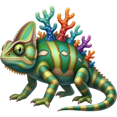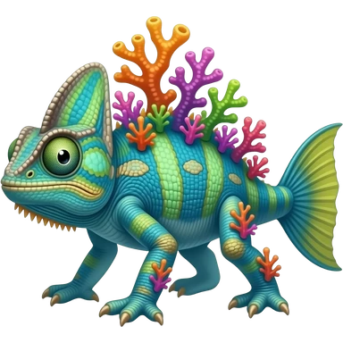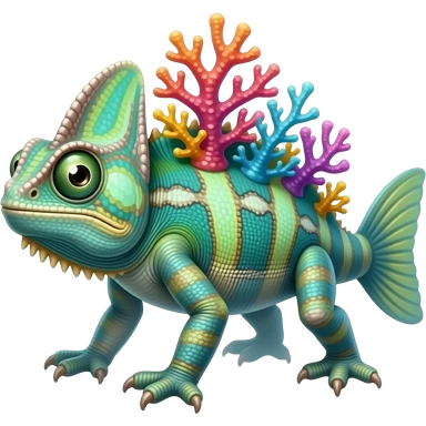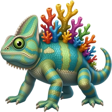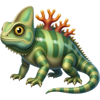 Coralisk A basilisk-like reef guardian with multicolor coral growths along its back, head, and legs, with shiny pearl-like eyes. It can shape hard coral barriers to defend its territory. Has fins to swim faster emoji