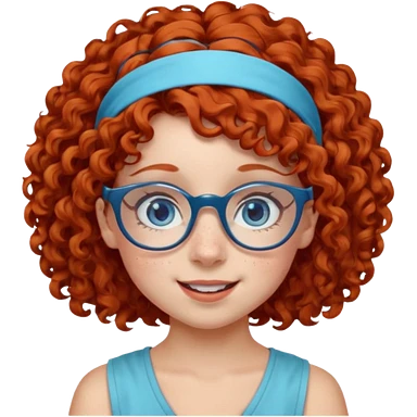 redhead kid with unique face features and very curly hair kid girl happy and big glasess and big nose and very blue eyes and headband with freckles emoji