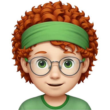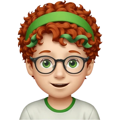 redhead kid with unique face features and very curly hair kid boy happy and big glassess and big nose and very green eyes and headband emoji
