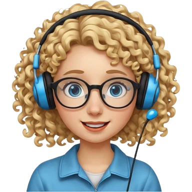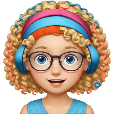 blond kid with unique face features and very curly hair kid girl happy and big glasess and big nose and very blue eyes with freckles kind of nerd looking and headphone wearing emoji