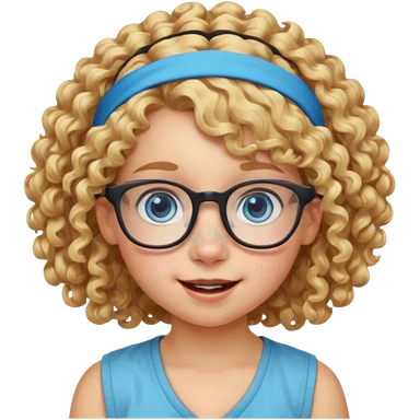 blond kid with unique face features and very curly hair kid girl happy and big glasess and big nose and very blue eyes and headband with freckles emoji