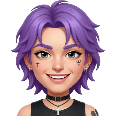 Pelo corto, morado con, estilo despeinado con corto sueltos. piercings en la nariz el labio, aretes brillantes las orejas, uno colgante en forma de cruz. ojos negros entrecerrados, cejas gruesas, sonrisa ladeada mostrando dientes, y pequeños tatuajes en la cara (como cruz, corona y corazón roto). emoji