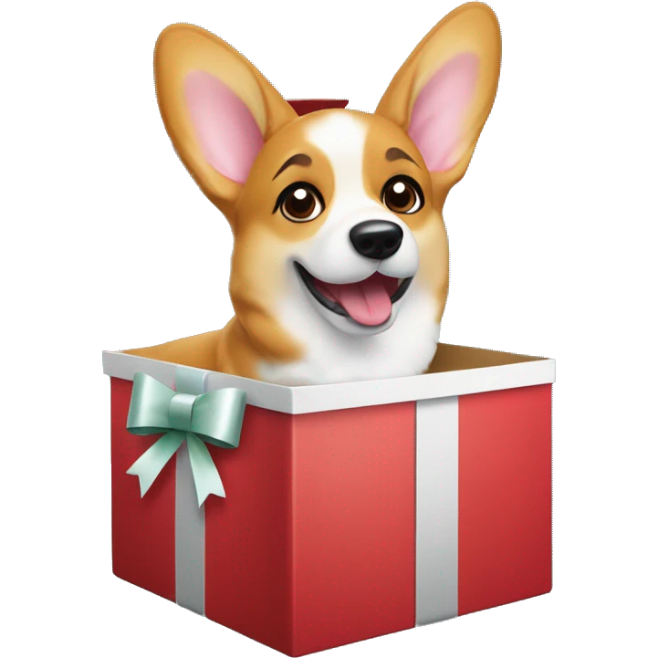 Corgi popping out of a wrapped Christmas gift box, with a bow on its head and a surprised look emoji | AI Emoji Generator