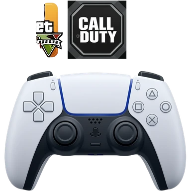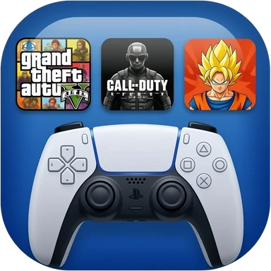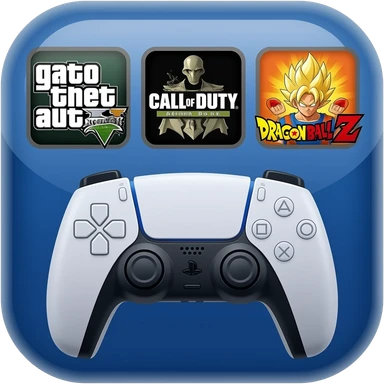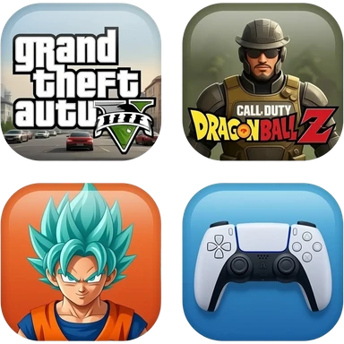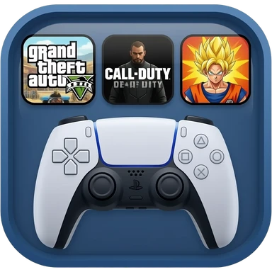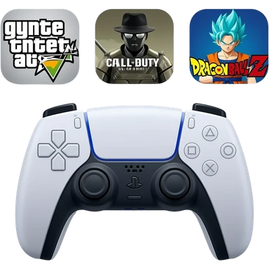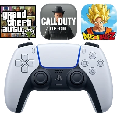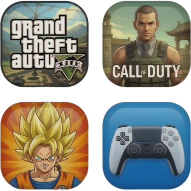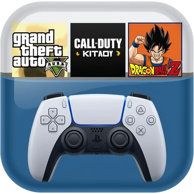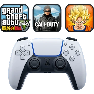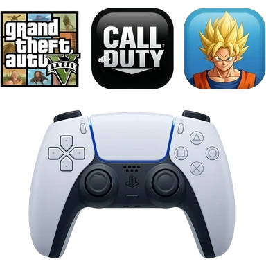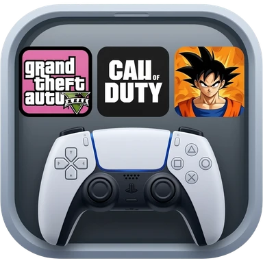 icone avec a l interieur des icone de jeu grand theft auto 5 call off duty et dragon ball z et une mannette ps5 devant emoji
