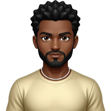 CoryxKenshin with dark brown eyes, black afro hair and short beard, ivory metallic t-shirt, white neck bracelet emoji