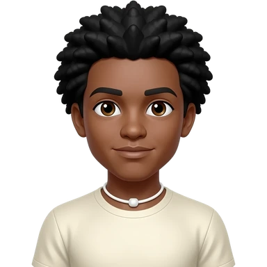 CoryxKenshin with dark brown eyes, black afro hair, ivory metallic t-shirt, white neck bracelet emoji