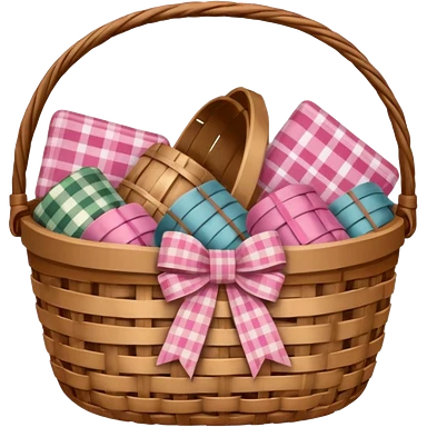 Cottagecore vintage basket, with plaid ribbon in pink snd earthy shades. No emoji faces, no emoji icons. emoji